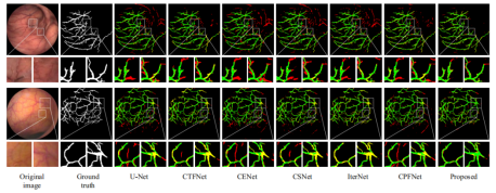 3.3 利用人工智能中的深度學習方法進行血管分割(相關成果正在第一輪審稿中)效果如下,綠色代表正確分割,紅色代表錯誤分割,黃色代表漏分割,我們的方法相比于現(xiàn)有的其他方法在腸壁血管分割中表現(xiàn)更優(yōu)異: